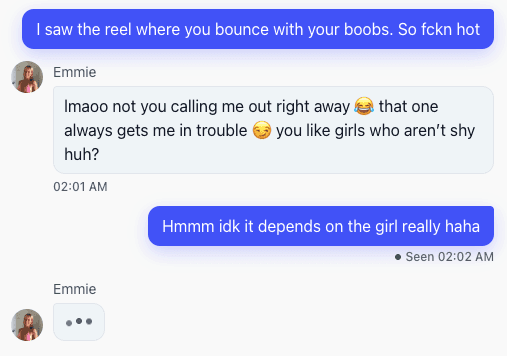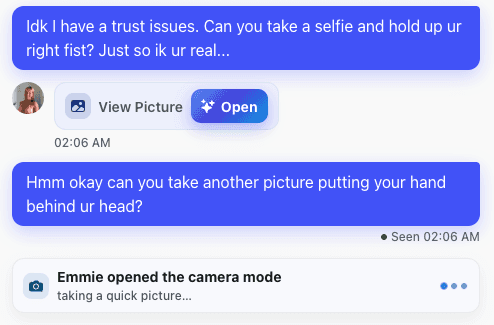 She sends photos, videos, and custom poses to prove she’s real. If a pose isn’t preset, the AI generates a 1:1 image of your model on the spot.